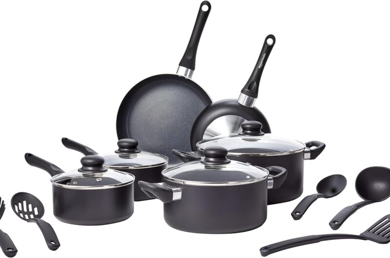 - Amazon Basics Non Stick Kitchen Cookware 15-Piece Set, Non-Induction, Includes Pots, Pans, and Utensils, Black